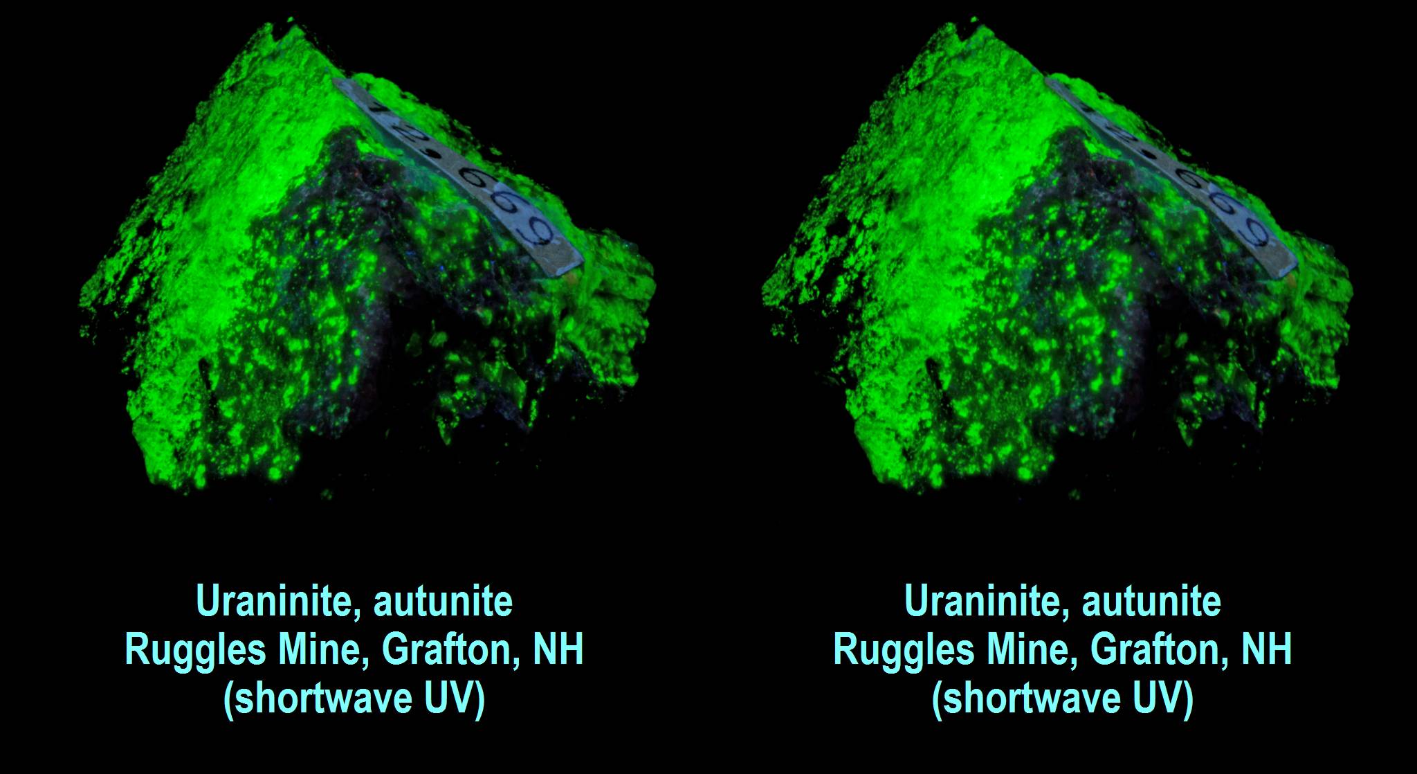 Uraninite, autunite - Ruggles Mine, Grafton, NH (shortwave UV)
