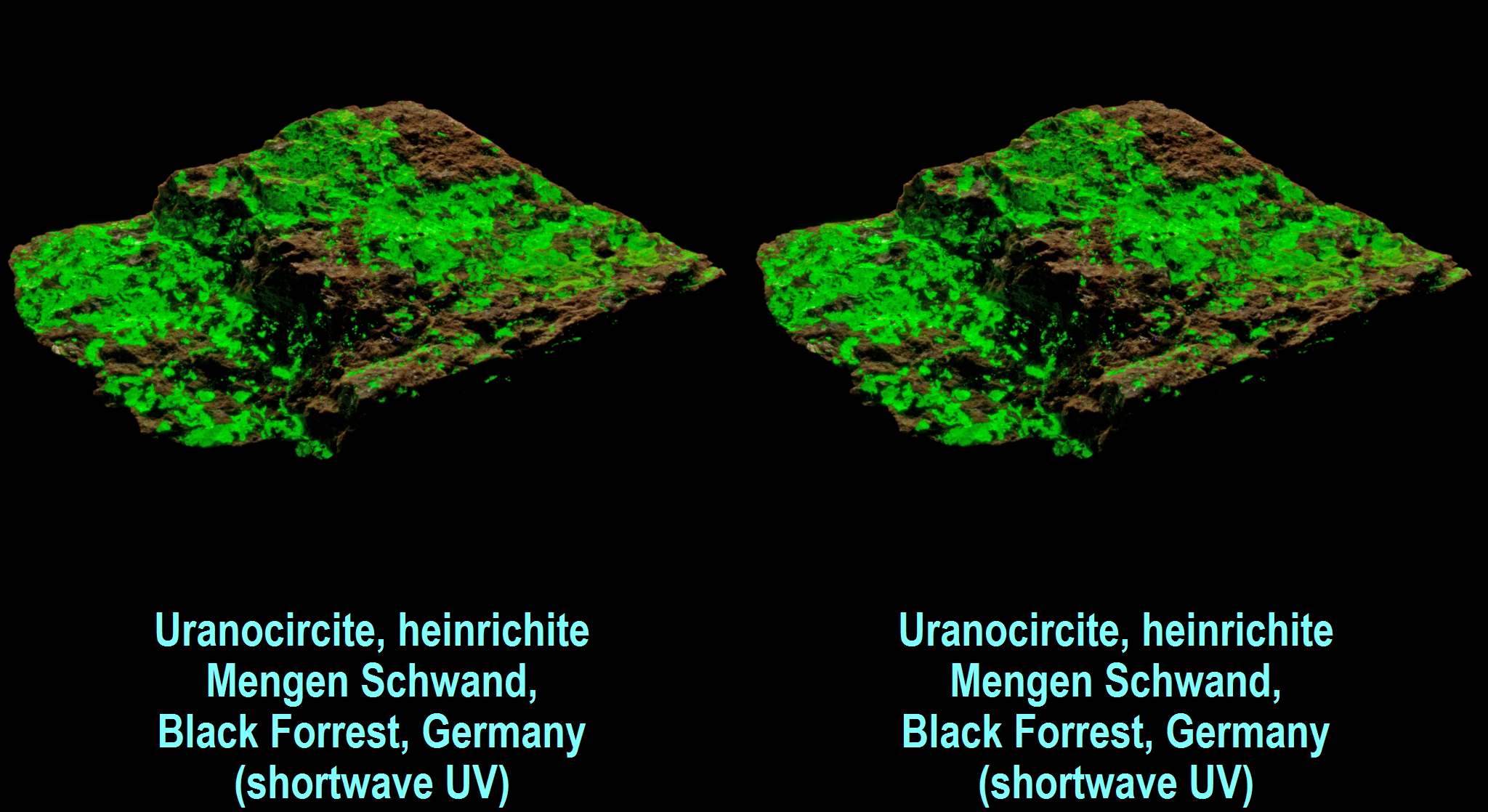 Uranocircite, heinrichite - MengenSchwand, Black Forrest, Germany (shortwave UV)
