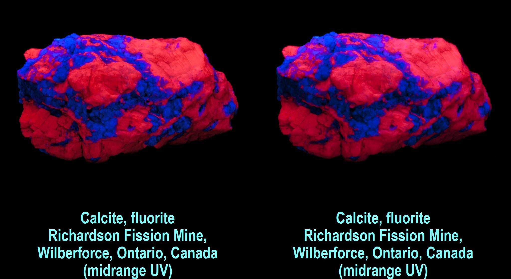 Calcite, fluorite - Richardson Fission Mine, Wilberforce, Ontario, Canada (midrange UV)
