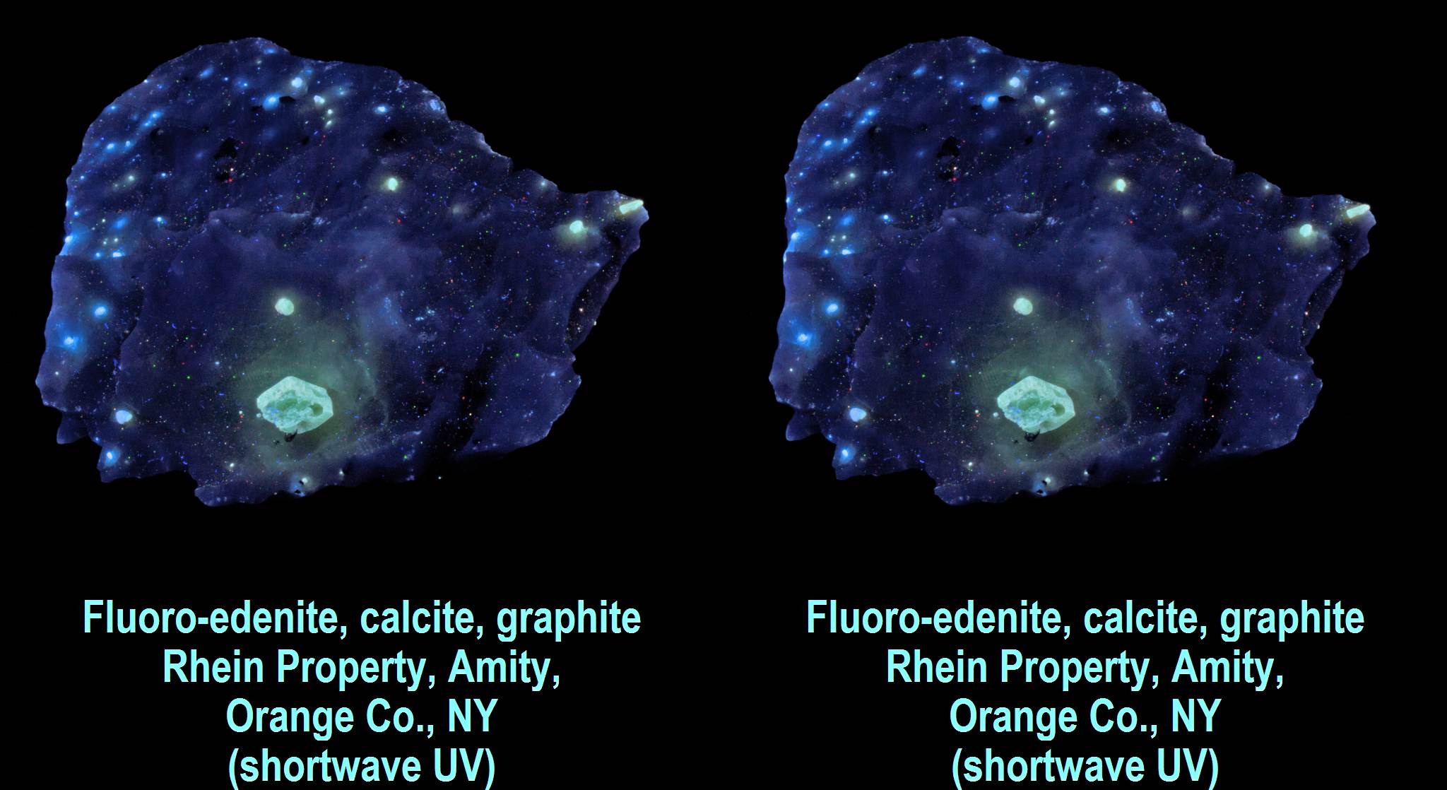 Fluoro-edenite, calcite, graphite - Rhein Property, Amity, Orange Co., NY (shortwave UV)