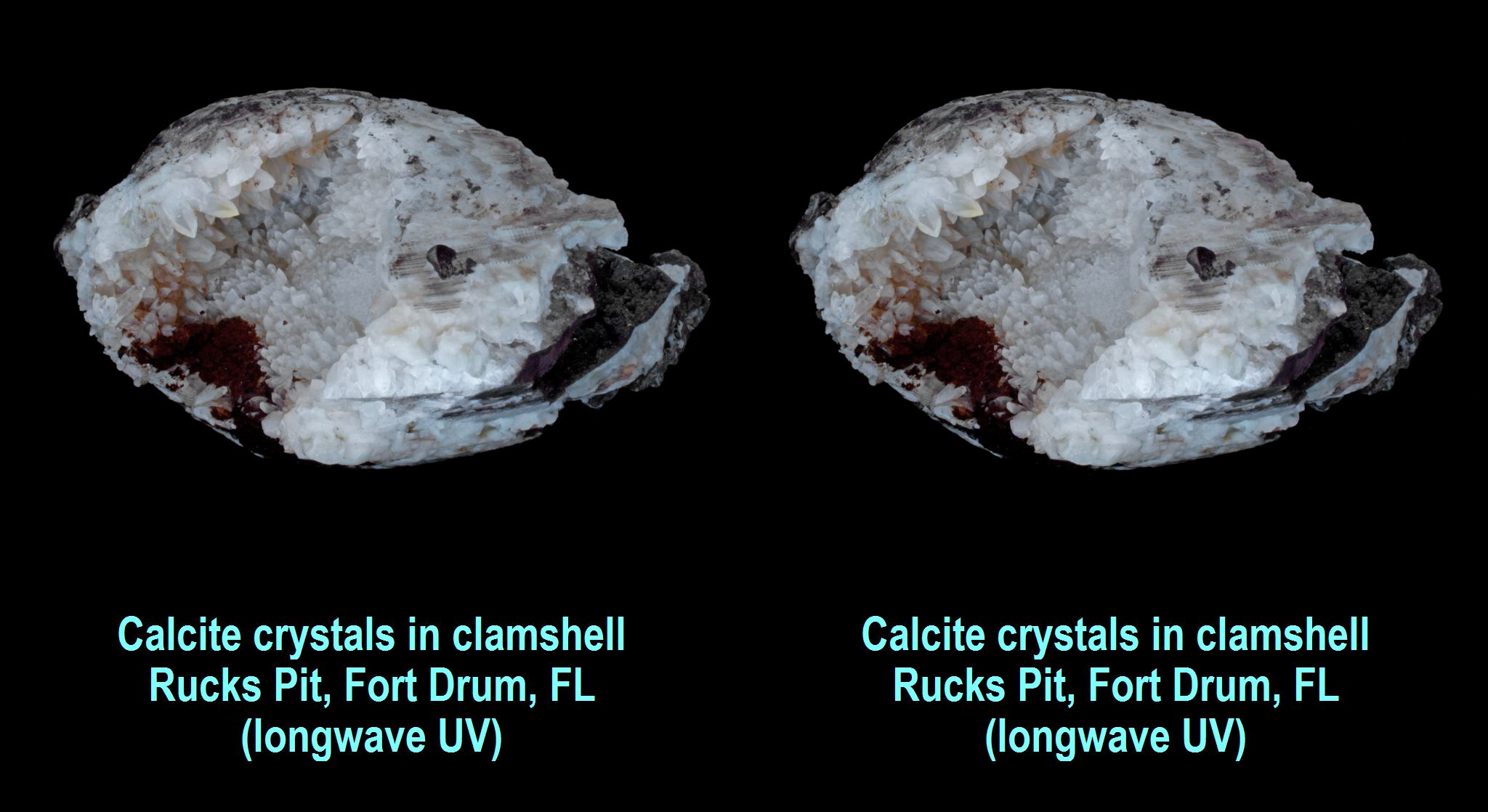 Calcite crystals in large clamshell - Rucks Pit, Fort Drum, FL (longwave UV)