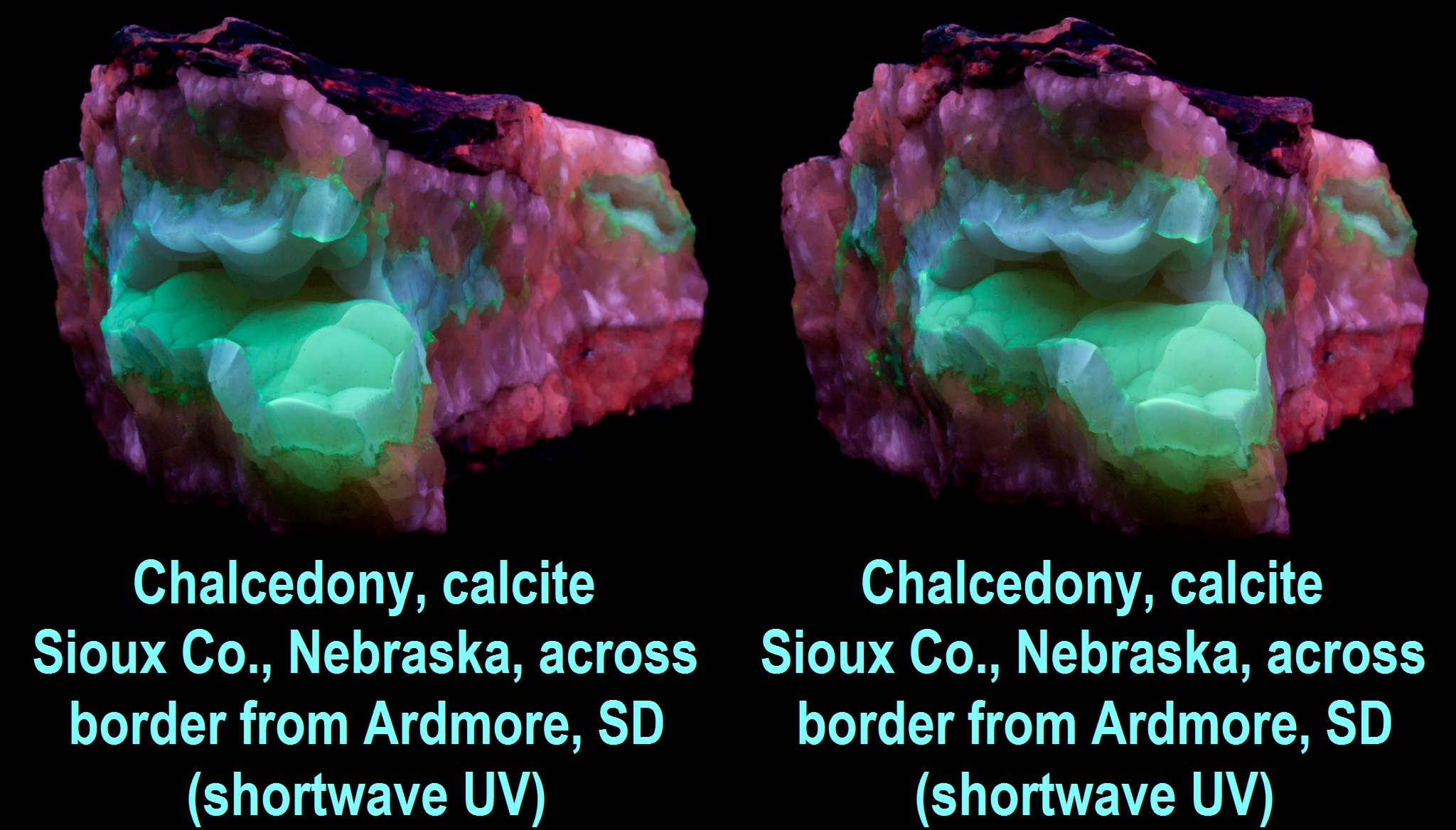 Chalcedony (SW fl. green, LW fl. tan), Calcite (SW fl., phos. pink), Sioux Co., Nebraska, across border from Ardmore, SD (shortwave)